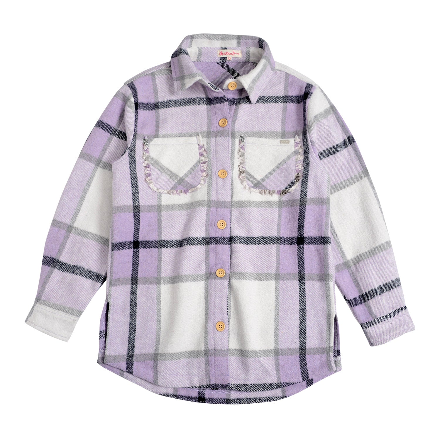 Camisa tela afranelada gruesa, tipo chaqueta, estilo leñadora, con botones y bolsillos con flecos.