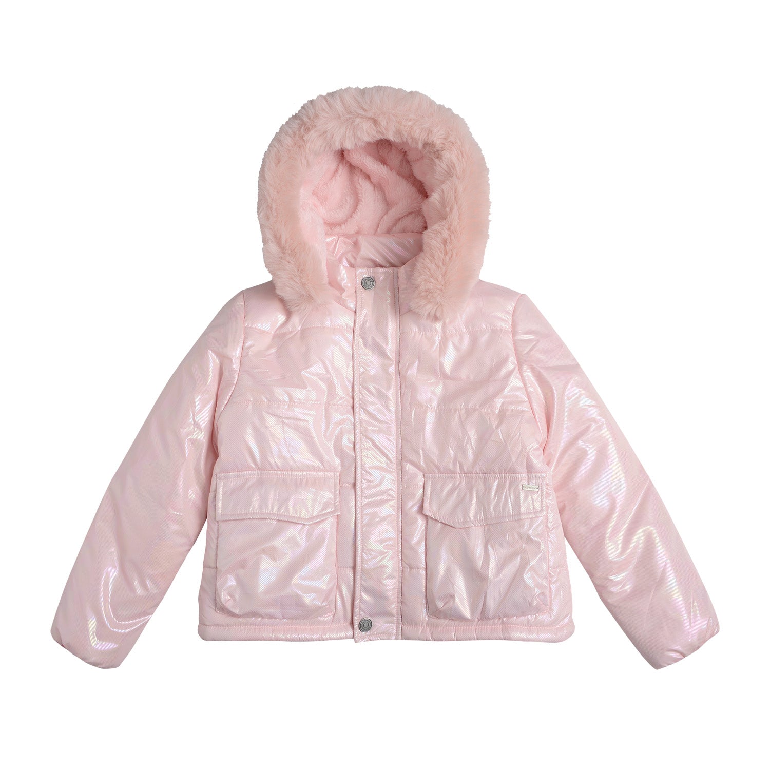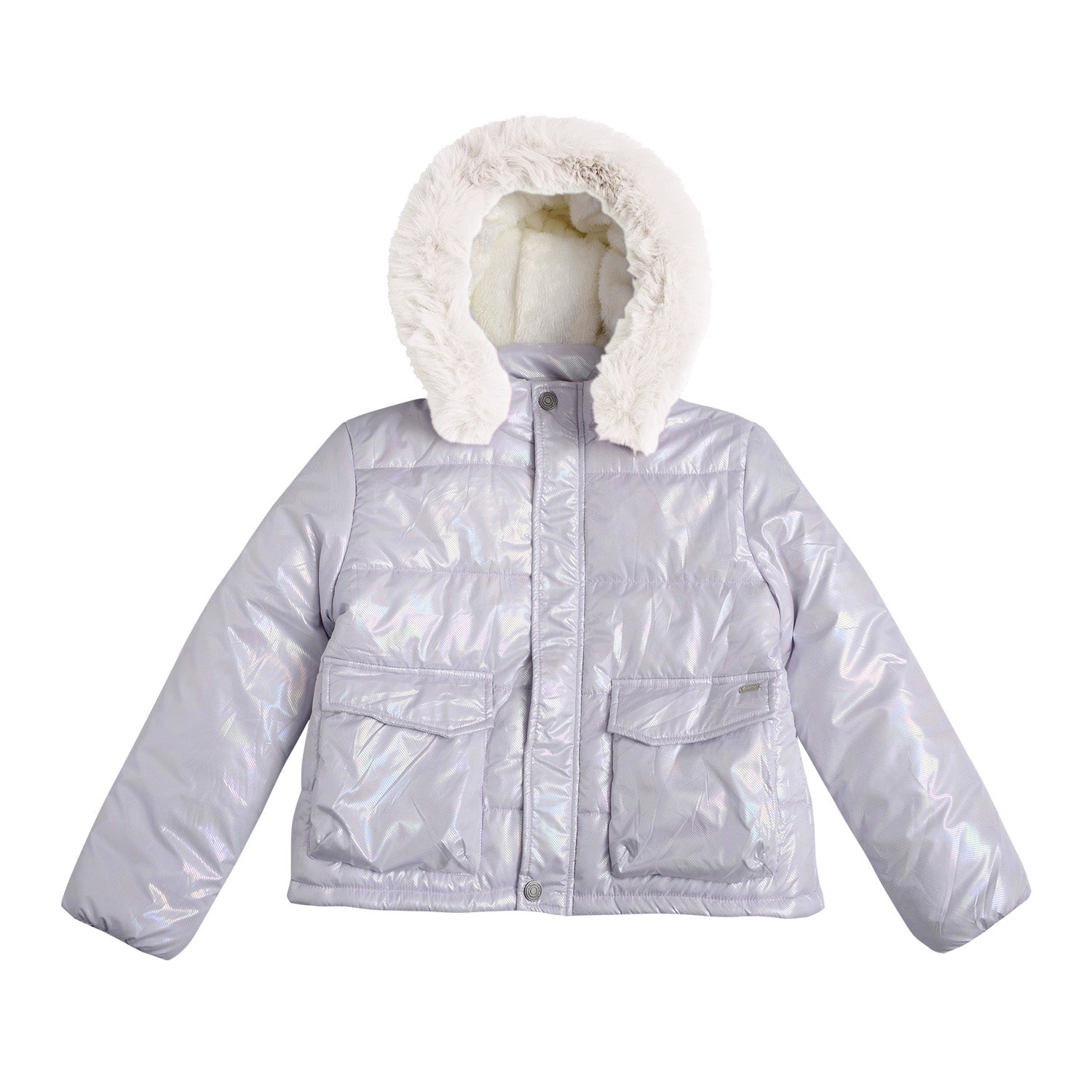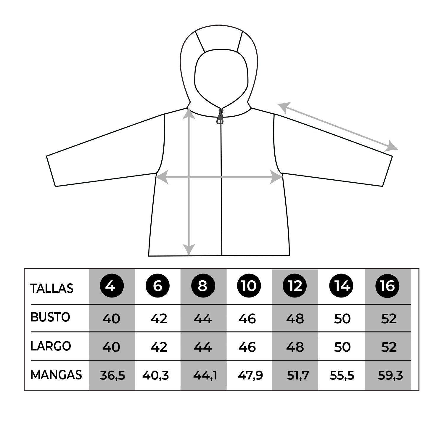Parka largo a la cintura, forro interior peludo, con gorro, cierre y bolsillos. Borde en gorro con chiporro.