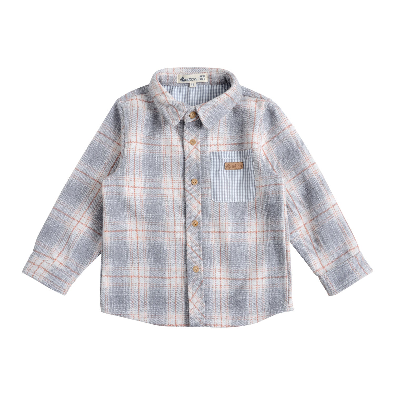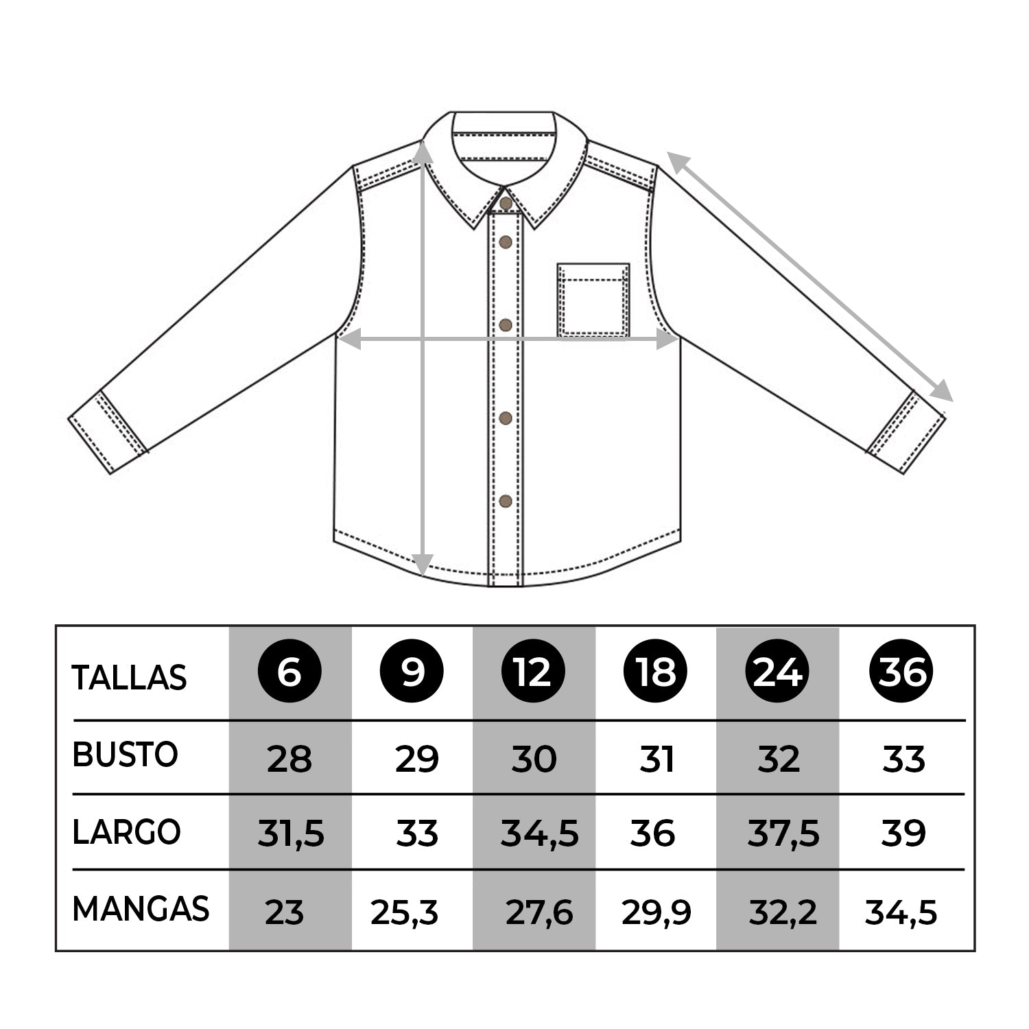 Camisa manga larga afranelada, escocesa, cuello camisa, botones y bolsillo delantero de tela.