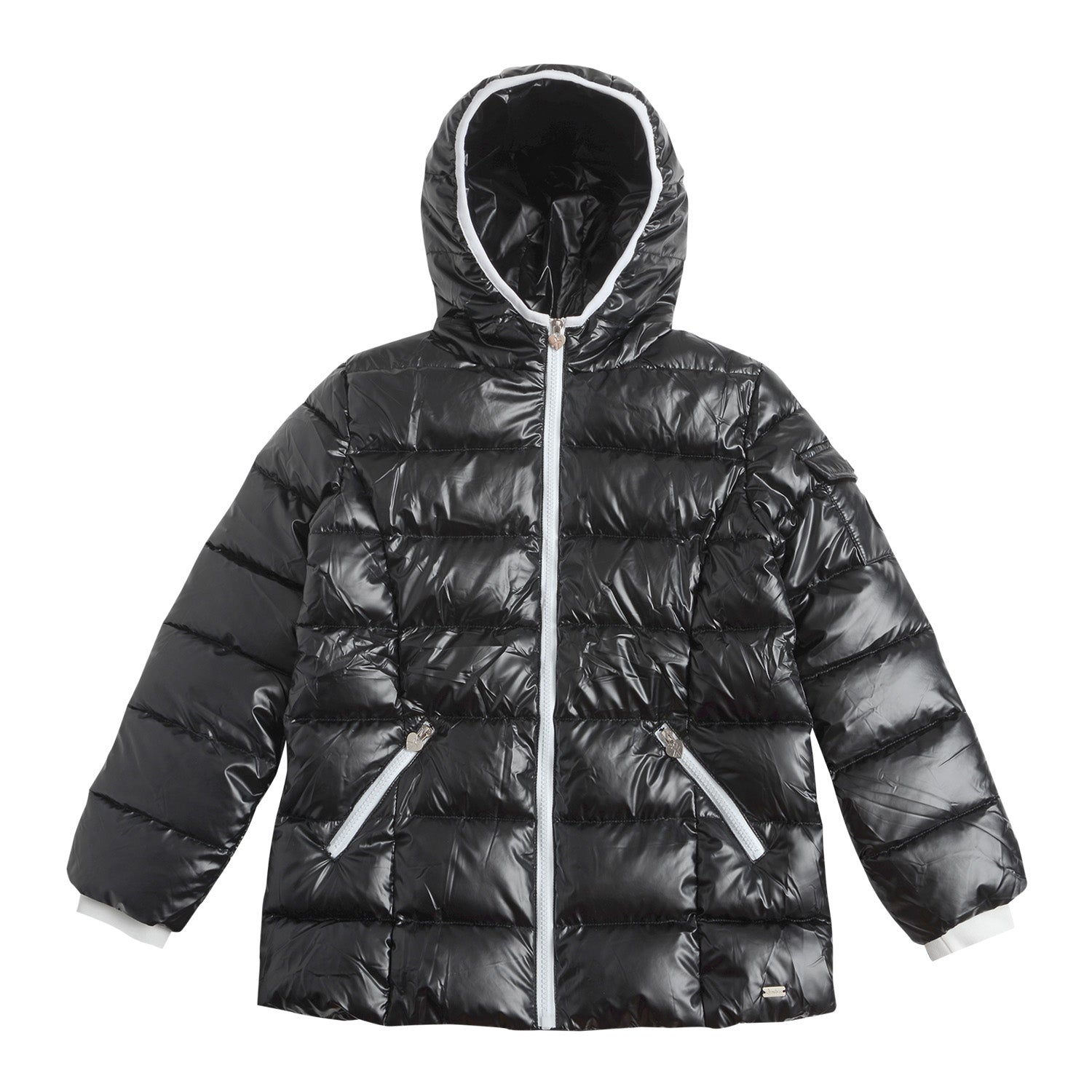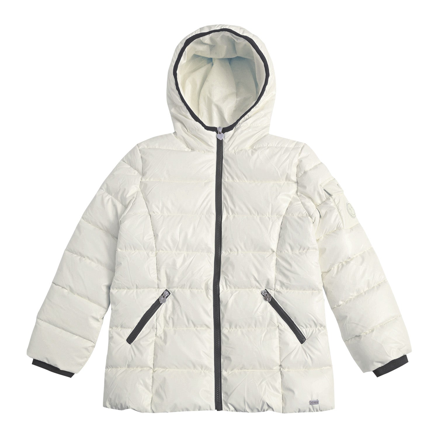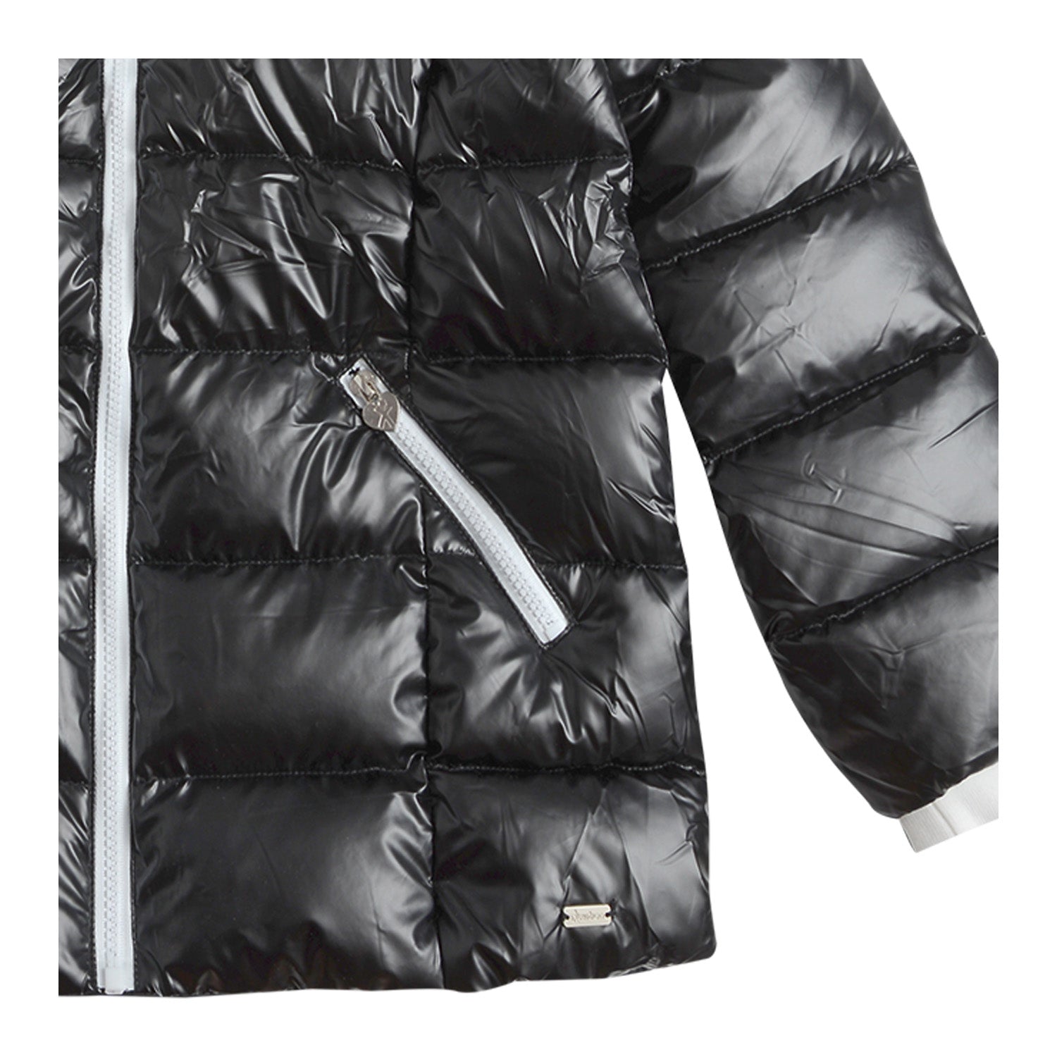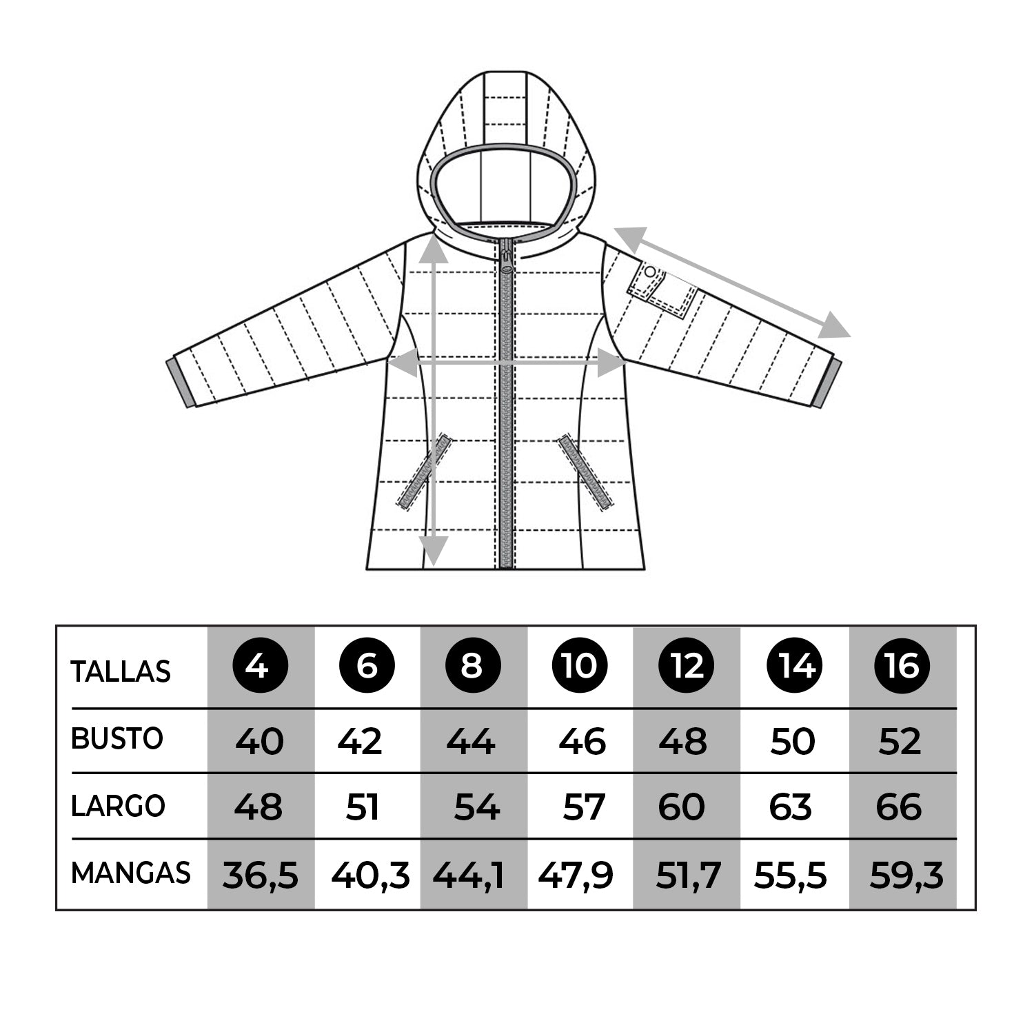 Parka engomada larga, con gorro, cierre y bolsillos con cierre. Puños en mangas.